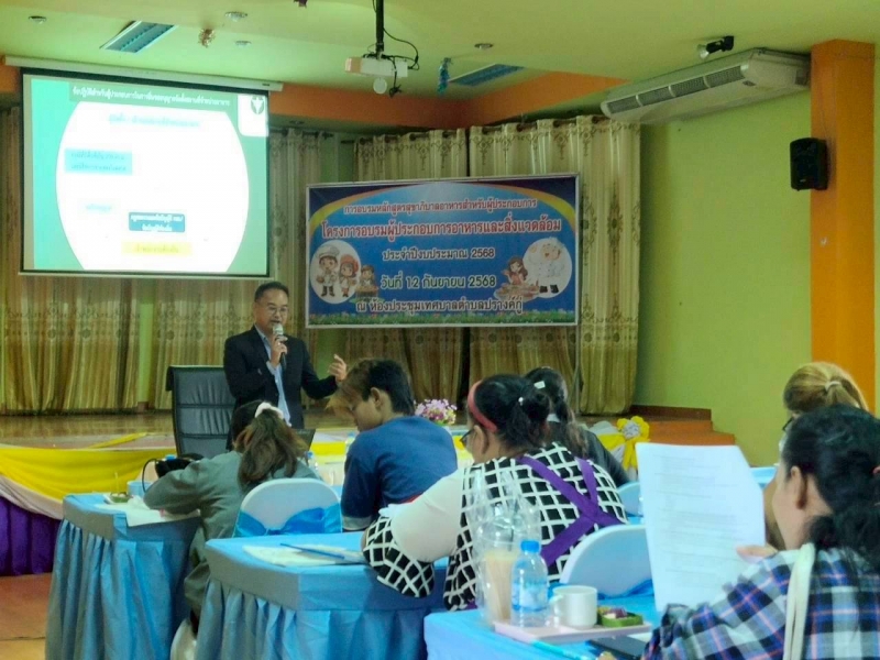 12 กันยายน 2568 ได้ดำเนินการจัดโครงการอบรมผู้ประกอบการสุขาภิบาลอาหารและสิ่งแวดล้อม ประจำปีงบประมาณ พ.ศ. 2568