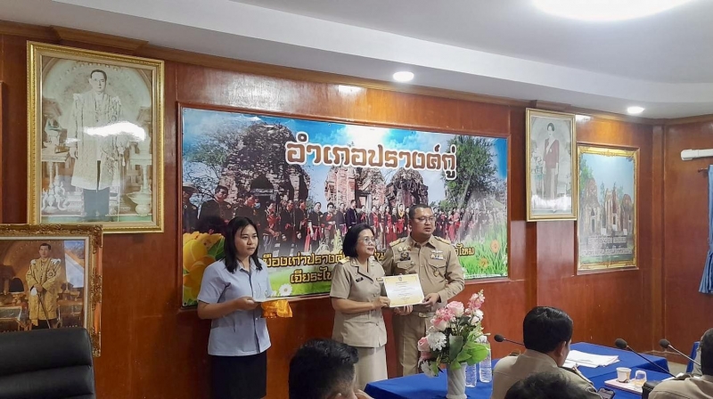 ขอบคุณนายแพทย์อัครเดช บุญเย็น ผู้อำนวยการโรงพยาบาลปรางค์กู่ และคณะร่วมอวยพรเนื่องในวันขึ้นปีใหม่พร้อมมอบของที่ระลึก นางวิไลวรรณ ทองละมุล หัวหน้าสำนักปลัด รักษาราชการแทนปลัดเทศบาล รับมอบ