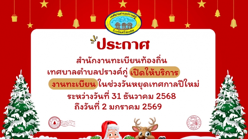 เทศบาลตำบลปรางค์กู่ สำนักงานทะเบียนท้องถิ่นยังคงเปิดให้บริการช่วงวันหยุดปีใหม่ วันที่ 31 ธันวาคม 2568 ถึง 2 มกราคม 2569