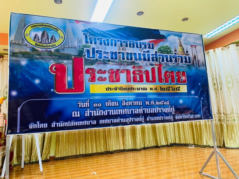 30 สิงหาคม 2565 เทศบาลตำบลปรางค์กู่ นำโดยนายชิษณุพงศ์ รตนะกมลเศรษฐ์ นายกเทศมนตรีตำบลปรางค์กู่ พร้อมคณะผู้บริหาร สมาชิกสภาเทศบาลฯ ร่วมกิจกรรมเปิดโครงการอบรมประชาชนมีส่วนร่วม ประชาธิปไตย ประจำปีงบประมาณ พ.ศ.2565 โดยได้รับเกียรติจาก นายคงยศ บุญรักษ์ รองผู้อำนวยการสำนักงานคณะกรรมการการเลือกตั้งประจำจังหวัดศรีสะเกษ เป็นวิทยากร ในการอบรมครั้งนี้